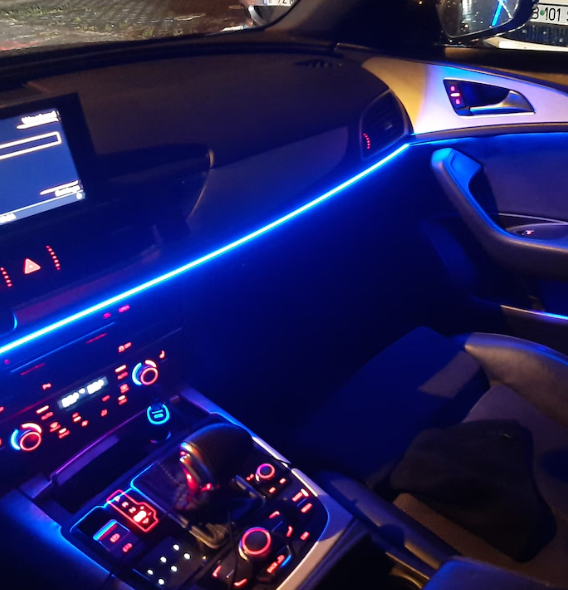 La controler-ul principal se mufeaza 2 benzi acrylic RGB, una de 35cm si una de 110cm pentru bord si 4 module pentru sub scaune. Cele 4 controlere secundare se conecteaza wireless la cel principal si de ele sunt mufate cate o banda acrylic pentru usi, cate un modul pentru buzunare usi si cate un modul pentru manere usi.