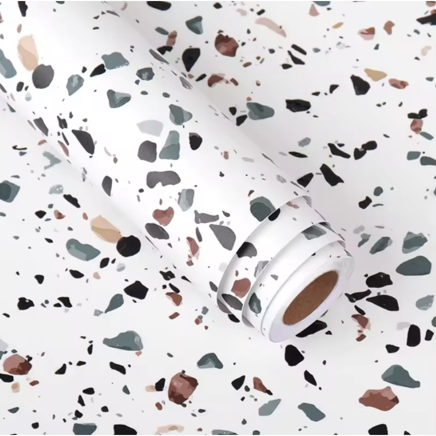 Transforma-ti spatiul cu Rola de tapet autoadeziv tip terrazzo, dimensiuni 60 x 500 cm.