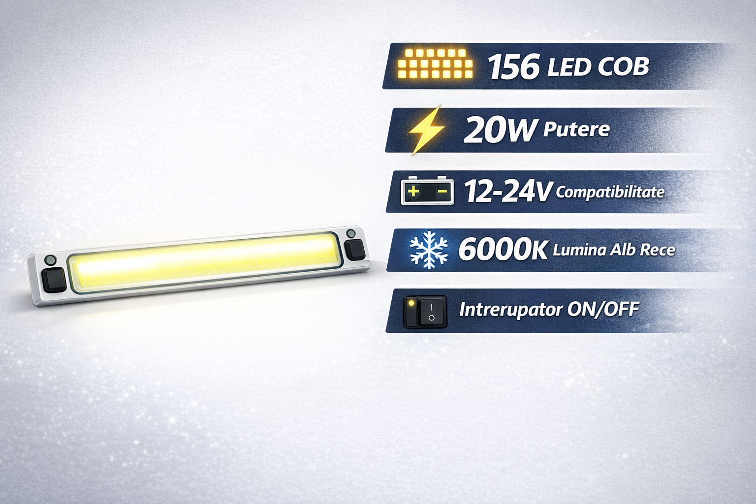 Tehnologia COB cu 156 LED oferă lumină intensă și uniformă, ideală pentru dube, camioane, rulote sau remorci.