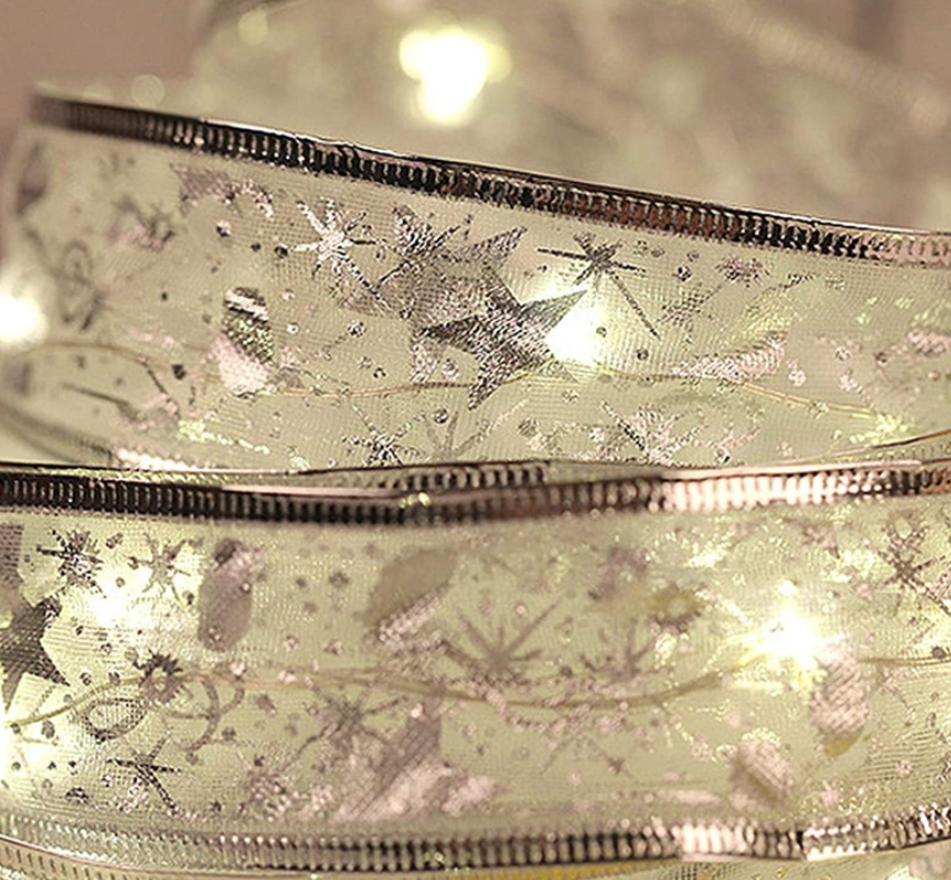 Design festiv cu model Crăciun: Panglica elegantă se potrivește perfect cu ornamentele tradiționale, oferind un aspect romantic și primitor – ideală pentru brad, coroane sau cadouri împachetate.